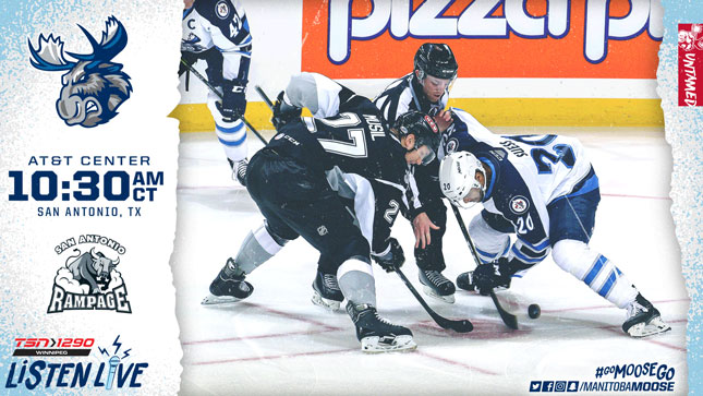Today the Manitoba Moose (7-6-0-0) make their first visit of the season to San Antonio where they face the Rampage (3-12-0-0). The game is also a school day game in San Antonio meaning the action starts at 10:30 a.m. CT. You can listen while you work on TSN 1290, the Moose App, moosehockey.com/listenlive, or if you have an especially cool boss, stream the game live on AHLTV.